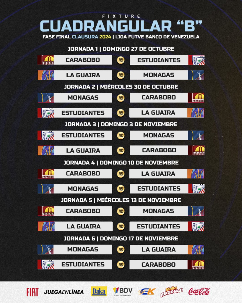 Cada grupo enfrentará partidos de ida y vuelta, y los ganadores de cada cuadrangular se convertirán en los dos finalistas que disputarán el título del Torneo Clausura. El equipo campeón de esta fase se medirá con Carabobo FC, campeón del Torneo Apertura 2024, en la Gran Final de la Liga Futve para definir al monarca absoluto del fútbol venezolano este año.
