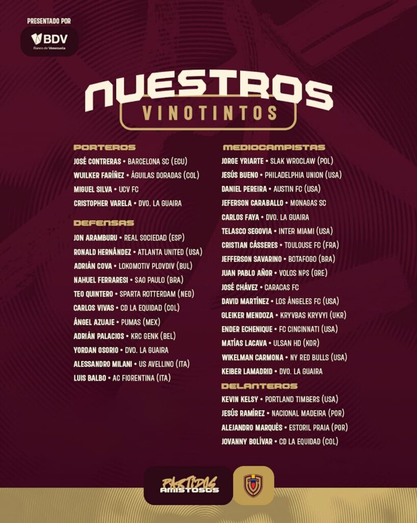 El combinado nacional contará con cuatro cancerberos; 11 defensores, con Jon Aramburu, Ronald Hernández, Nahuel Ferraresi y Alessandro Milani como principales nombres; 16 mediocampistas con nombres como los de Telasco Segovia, Cristian Cásseres Jr, Jefferson Savarino, Juan Pablo Añor o David Martínez como algunos de los destacados además de los mencionados del fútbol nacional; y cuatro delanteros.