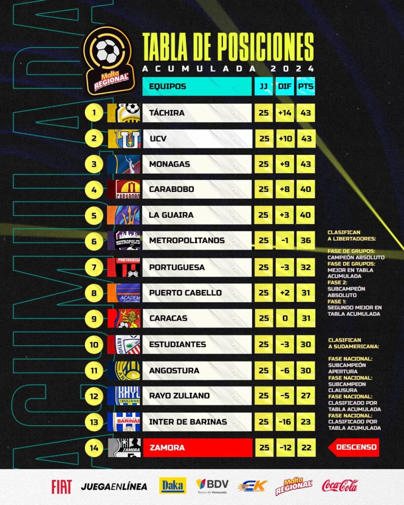 En la cima de la tabla acumulada, Deportivo Táchira, el equipo de la UCV y Monagas se encuentran igualados con 43 puntos cada uno. Estos tres clubes pelearán en la última fecha por el tan ansiado pase directo a la fase de grupos de la Libertadores 2025, un logro que no solo otorga prestigio internacional, sino que también representa un ingreso económico clave para la siguiente temporada.