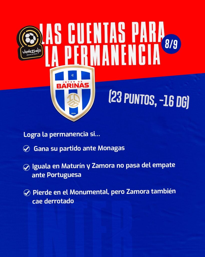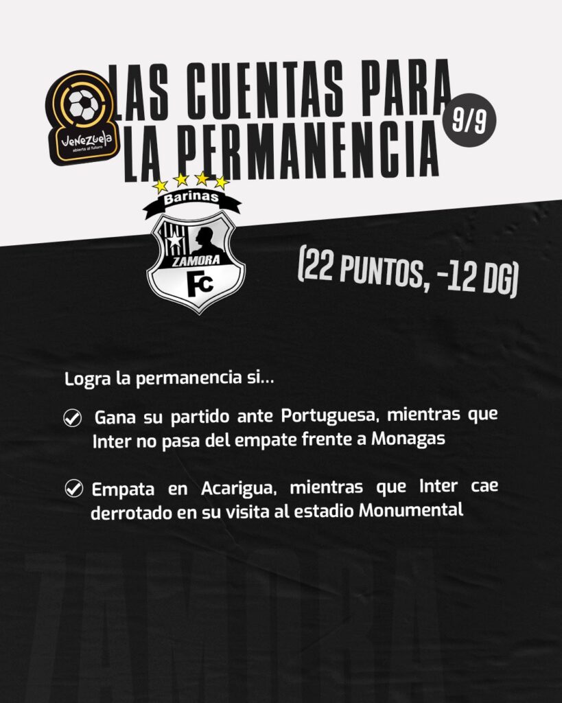 Inter de Barinas ha tenido una temporada para el olvido, acumulando solo un punto de los últimos 39 posibles. Su única esperanza de mantenerse en la categoría es ganar su partido y esperar que el «Blanquinegro» no sume puntos, una derrota del cuadro barinés y un buen resultado de Zamora sellarían su descenso.