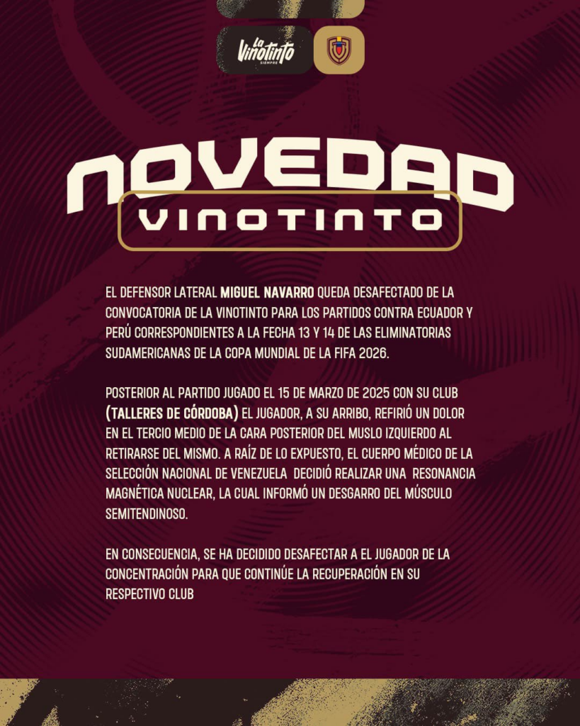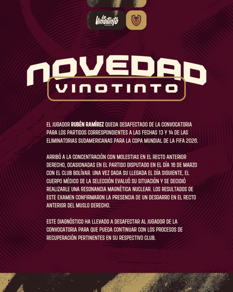 Este martes 18 de marzo, la Federación Venezolana de Fútbol anunció la baja por lesión de Rubén Ramírez para la doble fecha de las Eliminatorias para el Mundial 2026. Además, el pasado lunes ya habían informado sobre la salida de la convocatoria de Miguel Navarro.