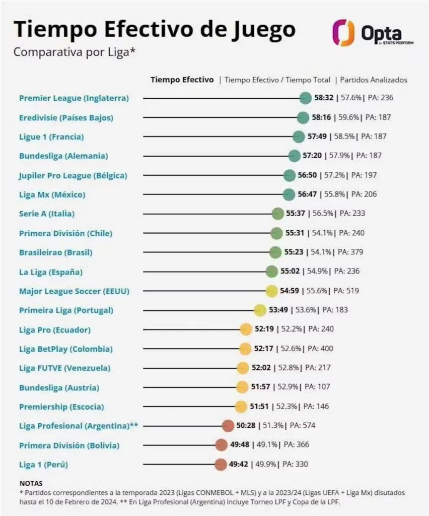 La liga venezolana tuvo un promedio de 52,8% minutos jugados en la Temporada 2023. A nivel continental, este tiempo solo supera al de las competiciones de Argentina, Bolivia y Perú.