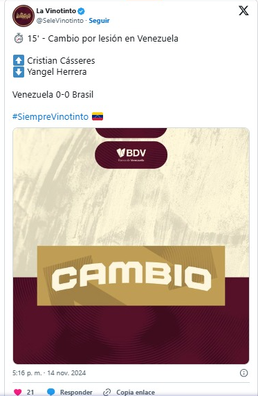 Sin embargo, a pocos minutos de haber empezado el choque en suelo venezolano, los criollos que fueron dirigidos en esta oportunidad por Leandro Cufré, presentaron contratiempos tras la salida del mediocampista Yangel Herrera, producto de una lesión en su tobillo derecho.